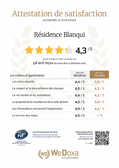 Située en plein coeur de Villeurbanne (69, Rhône), proche de Lyon et de Décine Charpieu, à proximité des commerces, l'EHPAD Blanqui accueille, en séjour permanent, les personnes âgées de plus de 60 ans. Organisé sur 5 niveaux, la maison de retraite dispose d'une capacité de 84 lits. Un accueil de jour thérapeutique, la "Villa des Roses" (6 places), accueille également des personnes atteintes de la maladie d'Alzheimer ou de maladies apparentées. Une équipe pluridisciplinaire est attentive afin d'assurer à chacun le confort, l'écoute et le respect.